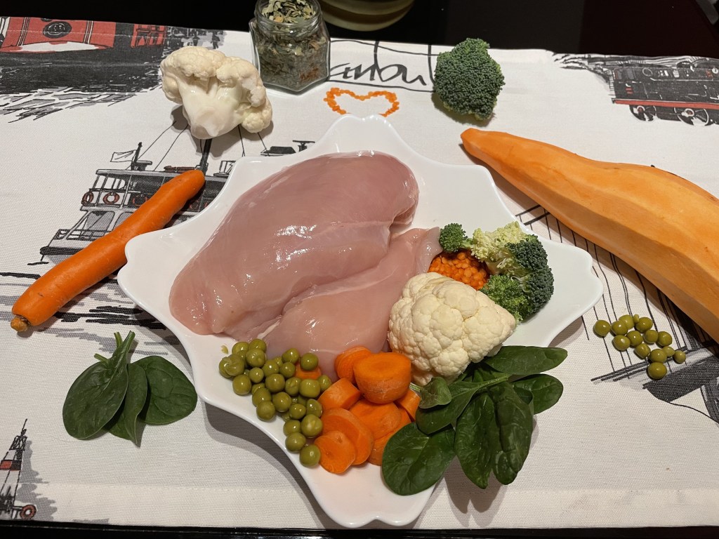 Към пилешкото месо карфиол, броколи, моркови, сладък картоф, грах, червена леща, спанак, ленено масло и пилешки дроб. Освен, че птиче месото участва в изграждане на мускулатурата, то е крехко, доставя омега 6 мастни киселини и е полезно както за поддържане на добро състояние на кожата, така и на лъскава козина. В допълнение набавя амино киселини и глюкозамин, които подмомагат здравината на костите.