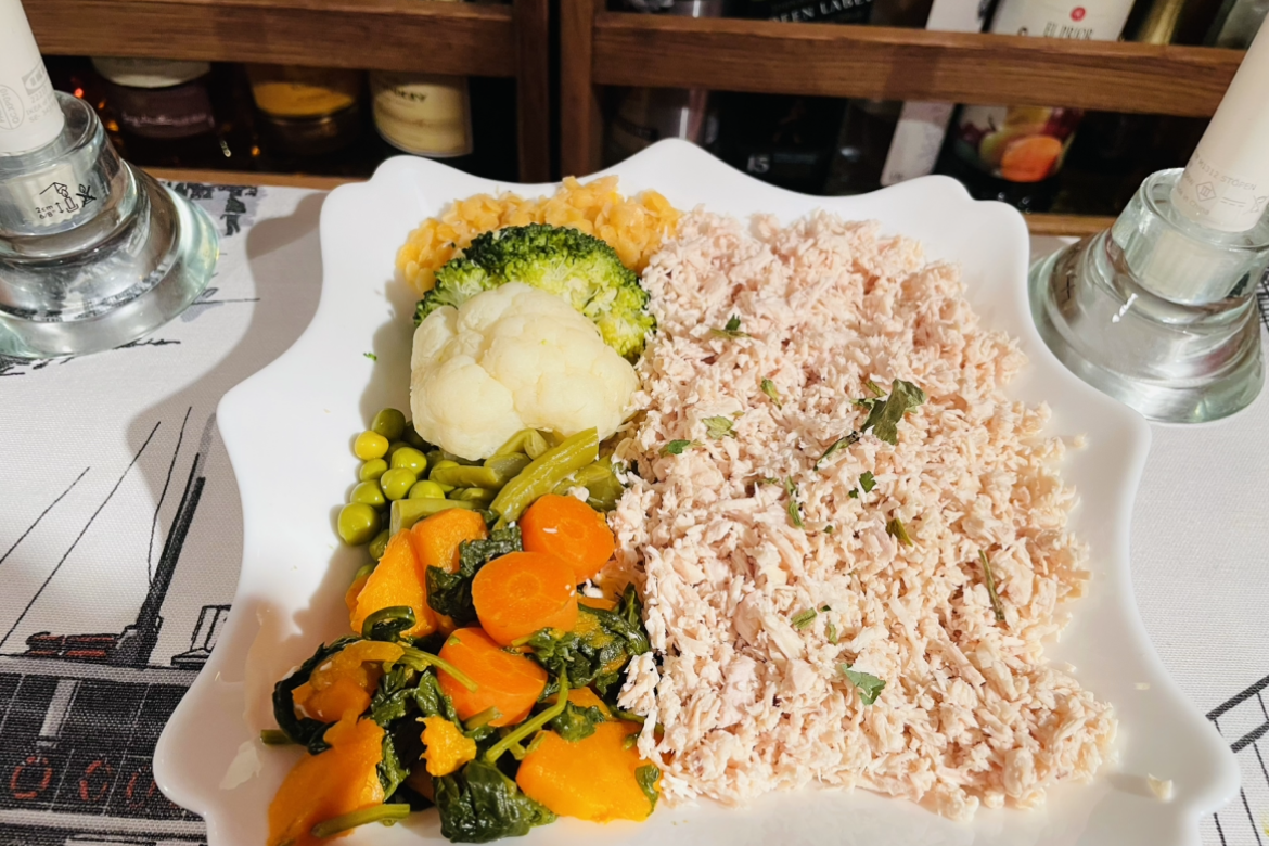 По-голямо съдържание в менюто се пада на месото, но към него съм добавила редица зеленцуци, които не само допринасят за вкуса на храната, но и набавят допълнително необходимите витамини и минерали. Към крехкото пилешко съм добавила: карфиол, броколи, моркови, сладък картоф, грах, червена леща, спанак, ленено масло.